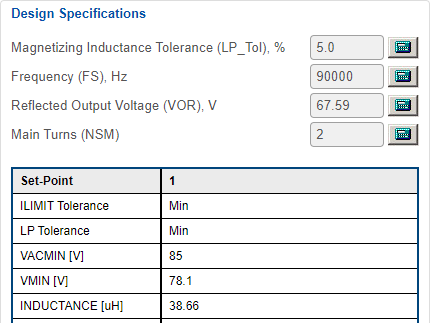 In the design specification block, you can change values of operating frequency, reflected output voltage, magnetizing inductance tolerance and the number of secondary turns by clicking on the icon