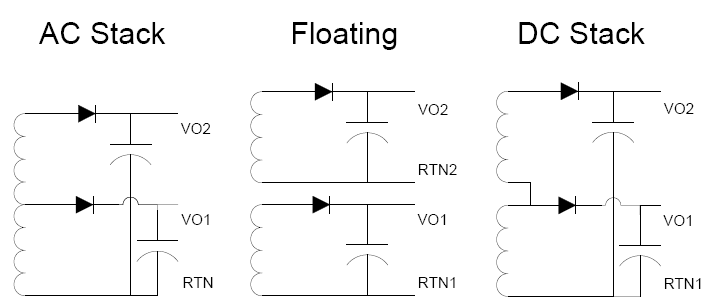 一般に、多出力電源では、フローティング出力巻線または AC 積み上げ出力巻線が使用されますが、DC 積み上げ出力巻線が使用されることもあります。フローティング巻線では、出力巻線ごとに別々のコンダクタが使用されます。これにより、必要に応じて各巻線の端をどちらも基準にできるため、自由度が最大限に高い設計が可能になります (それぞれの二次フローティング巻線は、互いにガルバニック絶縁になっています)。