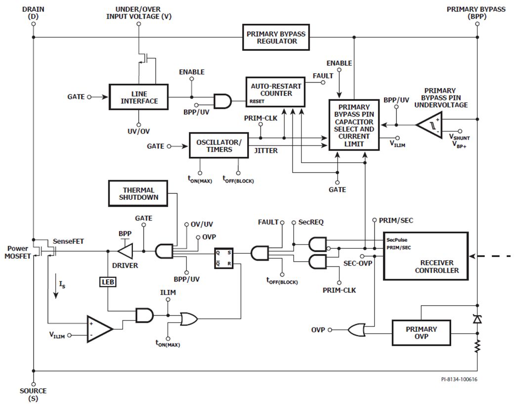 InnoSwitch-3 の一次側の内部回路の電源供給は、一次側バイパス ピン BPP に接続されます。内部レギュレータは、バイパス コンデンサ CBPP を 5 V に充電します。BPP ピンと S ピン間の電圧は、内部のクランプ電圧 (5.5 V まで) となります。次の 図 1 を参照してください。