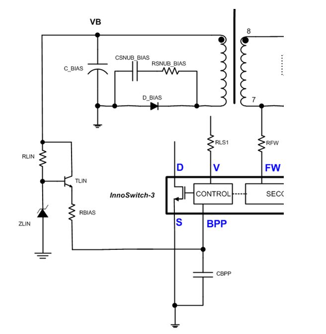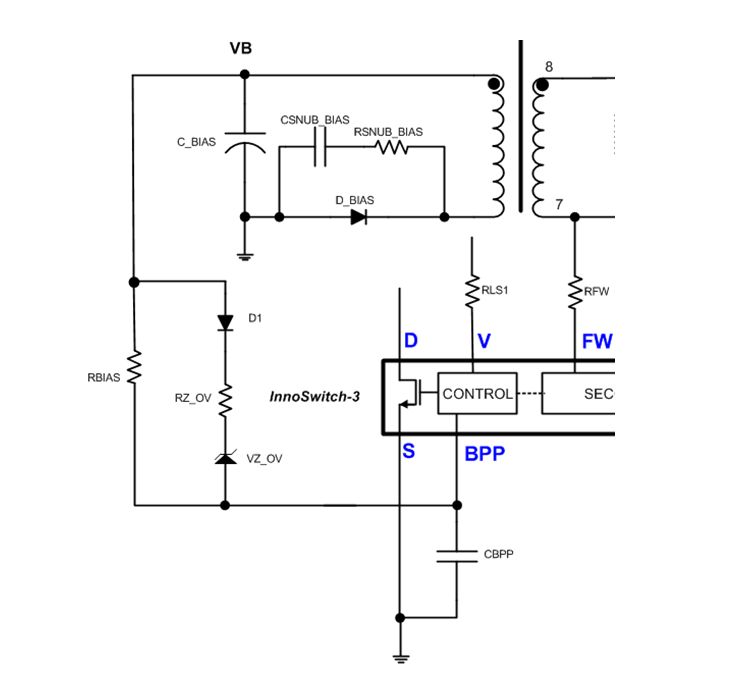 これにより、次の図 2 に示すように、バイアス巻線から InnoSwitch-3 に外部電力を供給しやすくなります。最も簡単なケースでは、バイアス電圧 VB は抵抗 RBIAS を介して BPP ピンに接続されます。