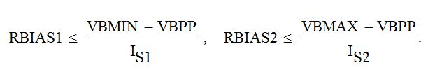 抵抗 RBIAS は、BPP ピンに VBMIN で IS1 以上の電流、VBMAX で IS2 以上の電流を供給するように計算する必要があります。結果として、次の 2 つの値の小さいほうが選択されます。