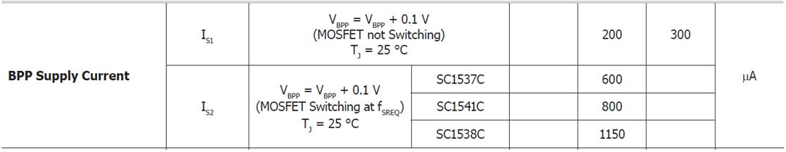 BPP ピンの電流消費とバイアス電圧 VB は、ともに無負荷時の IS1 と VBMIN から最大負荷時の IS2 と VBMAX に増加します。IS1 はすべての InnoSwitch-3 コントローラで同じですが、最大電流消費 IS2 は次のテーブル 1 に示すように、デバイスのサイズによって異なることに注意してください。