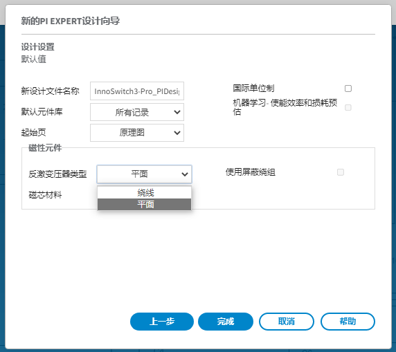 在设计创建向导期间,用户可以通过“设计选项”对话框中的“反激变压器类型”选择“平面”来创建平面反激变压器。
