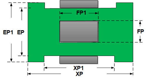 PCB结构尺寸 – 用户可以调整与外部电路相连接的连接点(引脚)的可用空间。分配给引脚的空间位于PCB板左右两端对称的XP-XP1的外延区域以内。 在垂直方向上,该空间可以从原来的EP尺寸延伸扩展至EP1的尺寸。