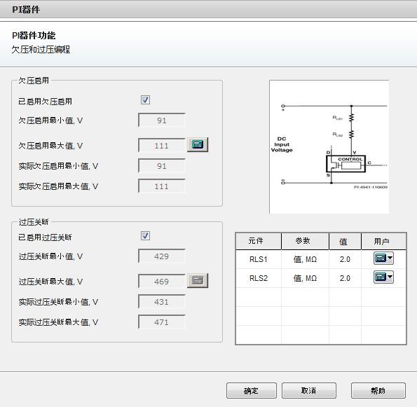 PI器件功能UV/OV表单显示与欠压和过压编程有关的计算值。此设计是可选的,要取决于PI Expert产品系列。对于有M引脚功能的TOPSwitch-GX或TOPSwitch-HX封装,根据设计选项中的M引脚功能值,会显示UV/OV或ILIM/PLIM表单。有关详细信息,请参阅L/M/V/X引脚功能。