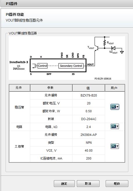 创建Innoswitch3设计时,PI Expert可计算和选择稳压管、晶体管和电阻。